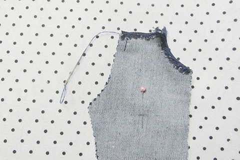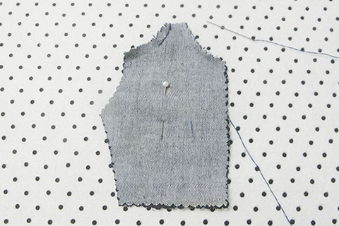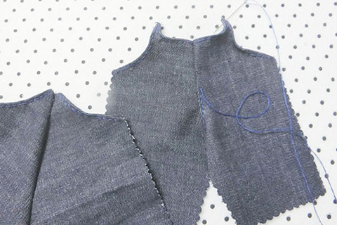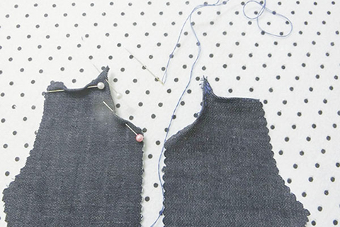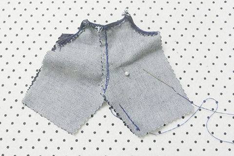 (九)將兩塊前幅褲布的領口、夾彎布邊位置向內摺起0.3cm,並用珠針固定好位置,再以平針的方法縫製。