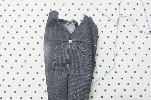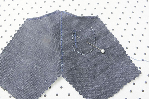 (十四)用珠針將後幅褲袋布固定在後幅褲的布面上,再以平針的方法縫製。