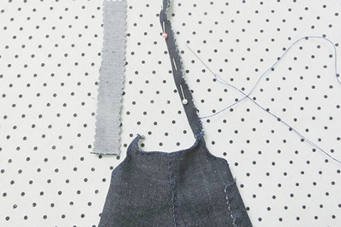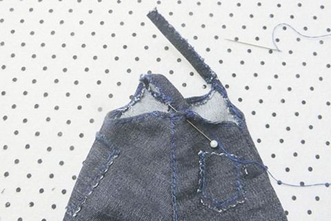 (十七)將兩塊布帶布對摺,其中一邊套入前幅褲的左右上夾彎布面約4cm長度的位置上,用珠針固定好位置後,再以鎖針的方法縫製。
