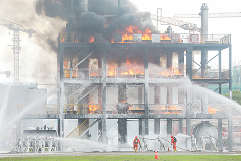 ◎ 六月一日,「江西應急.二0二二」綜合演練主演練場活動在位於江西南昌的江西省消防訓練基地舉行,演練內容為模擬一石油化工企業電源故障致某裝置循環冷卻系統失效、設備超壓、油氣洩漏,發生火災爆炸後,救援隊伍趕赴現場開展救援。本次綜合演練除主演練場外,還在南昌市、九江市、贛州市、宜春市設分演練場,旨在進一步提高江西省應對重特大災害事故應急救援指揮能力。圖為演練中消防攻堅組隊員身著銀色隔熱服在撲救一樓裝置火災,阻止火勢向臨近設備蔓延。(中新社記者 劉力鑫 攝)