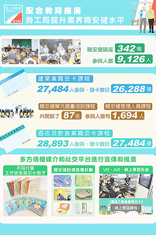 此外,持續編製不同行業的工作安全指引小冊子,提升前線人員的職安健知識;透過職安健設備推廣計劃提升業界職安健水平;利用VR、AR、網上學習系統等技術提升職安健學習體驗,以及使用多方傳播媒介和社交平台進行宣傳和推廣。