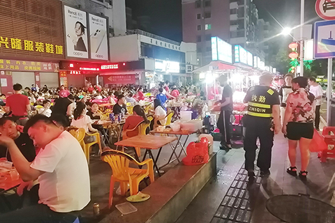 除少部分攤位是環繞夏灣購物市場的店面之外,絕大多數攤檔都是露天還是臨時性的。營業時間支起來,擺開來,營業結束就需要收攤收檔,讓清潔工人徹底打掃、沖刷、清洗。以致白天很難看出此處是珠海最火暴的夜宵場所。