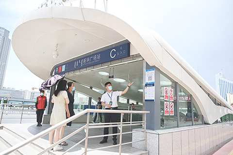 ◎ 六月十七日,內蒙古呼和浩特市,工作人員在新華廣場地鐵站口向乘客介紹免費乘坐地鐵方式。據悉,呼和浩特市於六月十七日、十八日兩天開展公共交通免費乘坐體驗活動。旨在倡導低碳、環保、健康的出行方式,踐行綠色出行理念。(中新社記者 劉文華 攝)