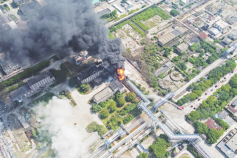 現場航拍畫面顯示,廠區內著火區域濃煙滾滾,廠區部份建築物已被火焰熏得焦黑。消防救援人員出動滅火車,並佈置多個滅火裝置對起火點進行撲滅。因現場溫度較高,救援人員調用十餘台滅火機器人,進行近距離遙控滅火,冷卻、保護周邊罐體。