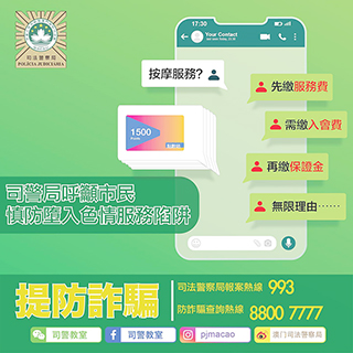 司警局明確指出,相關情況為俗稱「假援交」的色情服務陷阱,鑑於早前本澳曾發生多宗同類騙案並造成損失,局方呼籲市民網上交友須小心,如對方提出任何涉及金錢的交易、透露銀行或信用卡帳號個人資料、發送私密照片,甚至出外單獨會面等要求,均須提高警惕明確拒絕,慎防被不法之徒侵害或詐騙。