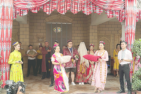 當天,「魅力新疆──海峽兩岸記者聯合採訪活動」來到位於喀什的香妃園,在園區講解員的熱情邀請下,吳泓勛和傅繼嫻分別扮做新郎和新娘參加婚俗表演,體驗了維吾爾族傳統婚禮的全過程。
