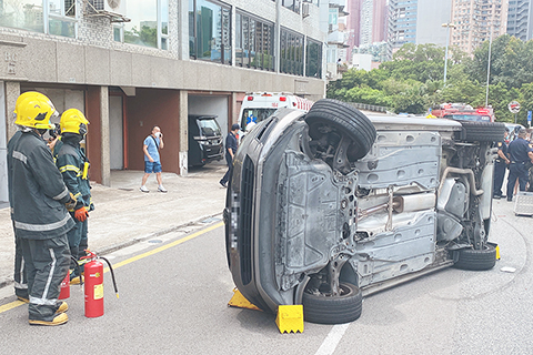 首宗交通意外發生在昨早約七時半,涉事車輛沿南灣湖景大馬路向旅遊塔方向行駛,期間失控自炒翻轉。車內五十多歲駕駛者左手臂挫傷。副駕座五十多歲女乘客,左手食指、右手背及胸部挫傷,情況並無大礙。駕車男子酒精讀數為零,意外期間亦未有人或動物衝出路面,私家車失控原因待查。