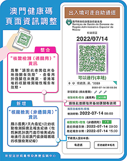 為優化澳門健康碼頁面顯示之資訊,原本於澳門健康碼的「核酸檢測結果」下方,會列出用於通關往來廣東、香港等地的核酸檢測陰性報告有效期,現更改為「核酸檢測(通關用)」下方點擊「請按此查閱往來各地通關有效期」,相關資訊改以彈窗方式顯示;