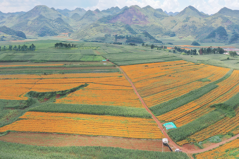 ◎ 七月二十九日,航拍雲南文山丘北縣的萬壽菊田。目前,正值萬壽菊成熟採收季節,在雲南文山壯族苗族自治州,豐收的萬壽菊田變成一片片金色的海洋。據了解,萬壽菊經提取後產出的萬壽菊浸膏可用作食品添加劑、著色劑等。(無人機照片)(中新社記者 劉冉陽攝)