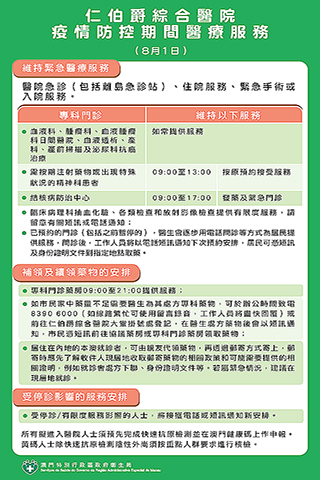 暫停服務期間受以上安排影響而未能按預約期到仁伯爵綜合醫院就診或接受治療或檢查服務的人士,將獲相關各科室電話或短訊通知新安排。