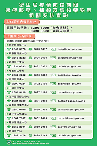 如居民家中藥量不足需要醫生為其處方專科藥物,可於辦公時間致電83906000(如線路繁忙可使用留言錄音,工作人員將盡快回覆)或前往仁伯爵綜合醫院大堂掛號處登記,各科已派駐值班醫生為有需要人士處方藥物;電話登記的居民,在醫生處方藥物後會以短訊通知,並憑短訊前往協議藥房或專科門診藥房領取藥物;