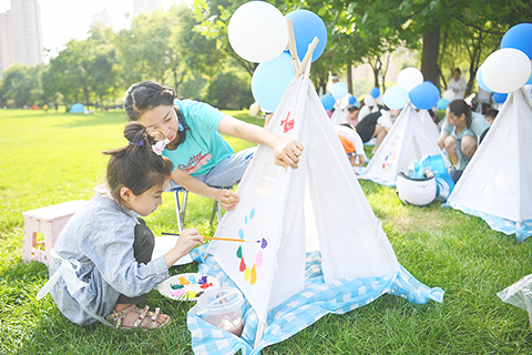 ◎ 七月三十一日,山西太原,家長與孩子共同繪製帳篷塗鴉,享受夏日假期時光。(中新社記者 武俊傑攝)