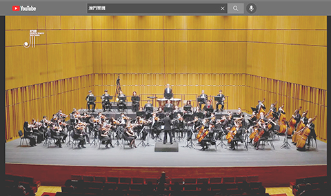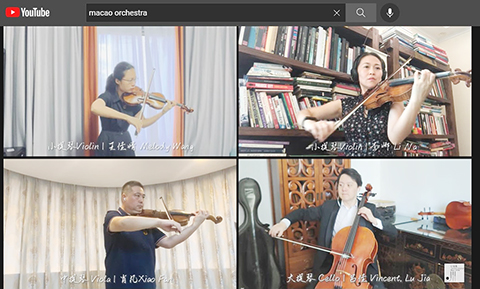 在全城靜止狀態期間,澳門樂團的四位首席進行了「雲上合奏」,包括樂團副首席王佳婧、第二小提琴首席李娜、中提琴首席肖凡及大提琴首席呂佳,四位演奏家身處不同地方透過線上視訊隔空合奏《同一首歌》,影片加入前線人員抗疫工作的相片。而澳門樂團助理指揮簡栢堅則透過線上視訊,訪問長笛首席翁斯貝及雙簧管首席開賽對工作默契到古典音樂的看法,與樂迷分享兩位樂師平日的工作。