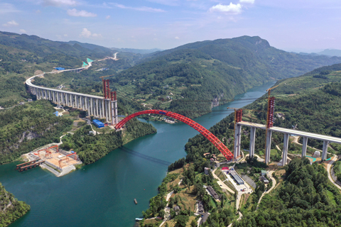 大橋主拱圈共六十個節段,最大吊裝重達一百五十七噸,大橋創新採用纜索吊系統,完成主拱圈的骨架和拱上結構的安裝。