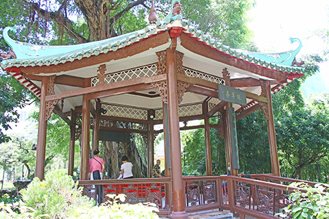 若再吟想梁披雲為此亭作的詩:「曲徑方塘得地偏,芳亭一角自清便。縱橫域外大瀛海,俯仰壺中小綠天。露竹風荷呼共語,長松高樹齊看肩。閑來漸覺滄州趣,樂與園林數歲年」,令人回味。◇(摘自網絡)