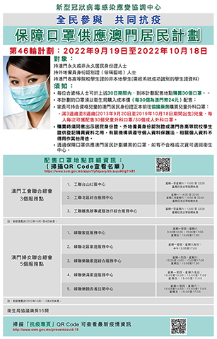 【特訊】新型冠狀病毒感染應變協調中心昨(十六)日公佈,第四十六輪保障口罩供應澳門居民計劃於下週一(十九日)開始,配售期間為三十日,即今年九月十九日至十月十八日,期間每人可一次性購買三十個口罩,售價合共二十四澳門元。衛生局協議藥房、本澳兩個社團(工聯、婦聯)繼續提供配售口罩服務。其中工聯轄下澳門工會聯合總會(工聯大廈)配售點於本輪停止配售。即全澳共有六十三個配售點,服務時間詳見附圖。透過口罩計劃購買的口罩,如有不合格或次貨可退回衛生中心。