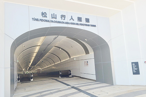 環松山步行系統工程主要建造貫穿松山南北兩端的行人隧道,新口岸區至高士德大馬路之間的步行距離,將由目前繞行松山的約一千一百米,縮短至約四百米。行人隧道內設有自動步行系統,可直接通往地厘古工程師馬路及松山馬路(松山跑步徑)的垂直升降機,為周邊出行的市民提供便利快捷的步行通道;工程並一併優化了羅理基博士大馬路由松山行車隧道東側至水塘馬路一帶的行人過路環境。◇