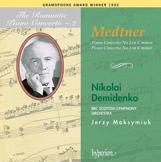 另一更值得推薦的唱片亦由俄羅斯鋼琴家主奏,曾於二零零六年訪問澳門的德米丹柯(Nikolai Demidenko 1955-)彈奏了梅特納的第二及第三號協奏曲,並由Jerzy Maksymiuk指揮BBC Scottish Symphony Orchestra協奏。德米丹柯擅長俄羅斯作品,他的演繹可說是力量與詩意的結合,節奏控制灑脫自如,觸鍵敏銳而感性,琴音在靈巧中顯露一股蒼勁,特具男性化豪邁魅力,也還原了俄羅斯特定時期音樂所獨有的質感。此片曾獲留聲機唱片大獎。(上)◇