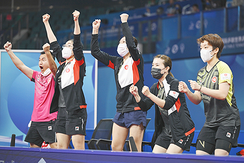 【中新社成都10月5日電】(記者 賀劭清)5日傍晚,隨著朱成竹一記絕殺,中國香港女團與羅馬尼亞女團決勝局的比分定格在11:9。香港女將們以三勝二負的成績結束了這場三個半小時的廝殺,成功與中國香港男團闖進成都世乒賽團體賽八強。