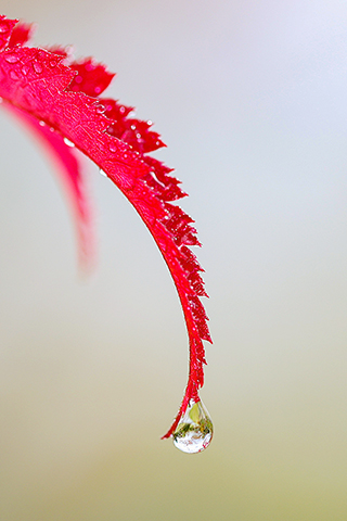 ◎ 貴州省黔東南苗族侗族自治州丹寨縣,楓葉上掛著露珠(十月二日攝)。新華社發(黃曉海攝)