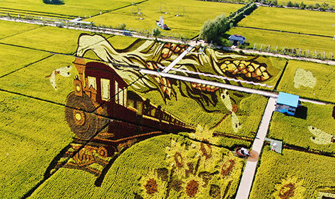 登上高27米的觀光鐵塔眺望,一幅幅巨型彩色稻田畫在陽光的照射下更顯壯觀、唯美。除了稻田美景,遊客還可在「稻夢空間」身臨其境地感受非遺文化、錫伯族的民俗風情等。