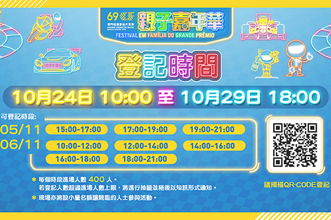 【特訊】第69屆澳門格蘭披治大賽車 - 親子嘉年華將於本年11月5日至6日在塔石廣場舉行,活動今年採取先登記後抽籤的方式分時段入場,有興趣參與人士可於10月24日上午10時至10月29日下午6時進行線上登記,中籤者將於11月1日至2日收到短訊通知。