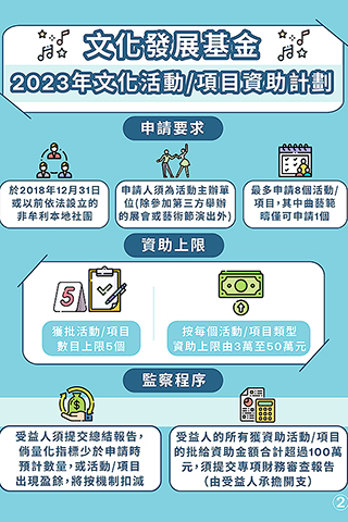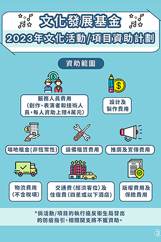 二0二三年度「文化活動/項目資助計劃」的資助期為二0二三年一月一日至二0二三年十二月三十一日,資助範疇包括:視覺藝術、文學創作、音樂、曲藝演出、戲劇、舞蹈、物質及非物質文化遺產(包括粵劇長劇演出)、時裝、設計、影視及動漫相關活動和項目。