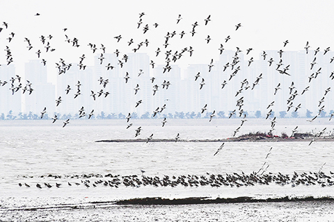 候鳥翔集青島膠州灣 2022-11-07 03:30:00 ◎ 十一月六日,在山東省青島市膠州灣海洋公園河套段濱海濕地,成群白腰杓鷸在海岸飛行覓食。隨著候鳥遷徙進入高峰時段,膠州灣海洋公園濱海濕地迎來翹鼻麻鴨、黑腹濱鷸、白腰杓鷸等數萬隻候鳥遷徙過境駐留,場面壯觀。(中新社發 王海濱 攝)