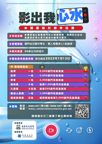 【特訊】為加深澳門中學生對澳門水資源和節約用水的關注,海事及水務局舉辦《影出我心水-水資源短片創作比賽》,收件日期由今日(十四日)起至二0二三年一月十三日。