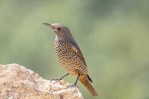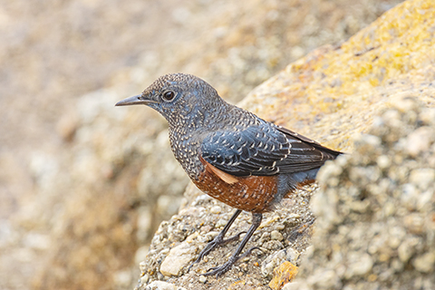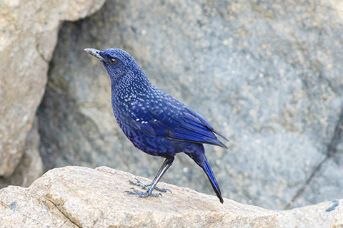 藍磯鶇,是中等體型的青石灰色磯鶇,雄鳥上體幾乎純藍色,兩翅和尾近黑色;下體前藍後栗紅色。雌鳥上體藍灰色,翅和尾亦呈黑色;下體棕白,各羽綴以黑色波狀斑。夏季時常棲息於多岩石的山地或海岸上。冬季時南遷,偶見於城牆、古塔、廢墟等處。牠們取食或由高處直落地上捕取,或驟然飛出在空中捕食飛蟲。雄鳥在繁殖期中善於鳴叫,鳴聲富有音韻,十分動聽,繁殖期在每年的四至七月,巢置於山腰的岩隙間,主要以昆蟲為食,如螻蛄、蝗蟲等,也吃蜘蛛。分佈廣泛,為留鳥及候鳥,見於歐亞大陸、中國、菲律賓、東南亞、馬來半島、蘇門答臘及婆羅洲。是馬爾他的國鳥。◇(摘自百度)