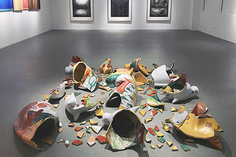 中國藝術研究院文學藝術院院長朱樂耕教授展示了他著名的馬頭陶瓷雕塑的解構性版本,在頌揚金、元時期濃郁民間藝術特色的「紅綠彩」中,展現了一個如考古挖掘現場式的裝置作品。同樣來自中國藝術研究院的陶藝家高振宇老師則展示了「石核」系列的器型雕塑,其製作方法大刀闊斧,高溫柴燒的紫砂陶猶如被切削的木塊,柴窯自然飄落的灰釉成就了妙趣天成的肌理。梁藍波和博士生楊超合作的《乾杯吧,澳門!》則是對景德鎮青花陶瓷的後現代演繹──澳門啤酒罐和茶壺上覆蓋著澳門大三巴地標、葡國瓷磚紋樣、雙語文字和狂草書法,代表著多元文化交融共存的澳門。