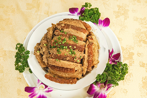 將削皮切好的荔浦芋片放入鍋中油炸濾乾,上等五花肉油炸後泡水至浮皮,兩者一起經豆腐乳、桂林三花酒、秘製扣肉香粉等均勻調味後,間隔擺盤,一碗碗送入蒸籠。蒸好的荔浦芋扣肉熱氣騰騰、芋香撲鼻。一片芋頭一片肉齊送口中,粉糯的芋片沁滿肉汁,鮮、鹹、香充溢味蕾,令人滿足。