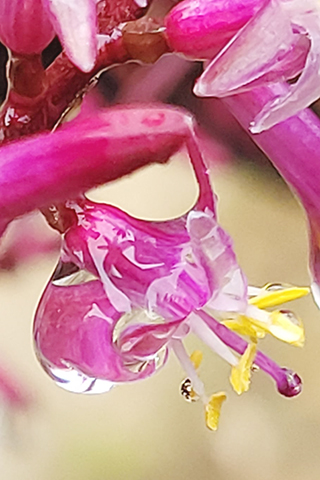 朱蕉為百合科、屬直立灌木植物,高一至三米。葉聚生於莖或枝的上端,綠色或帶紫紅色,葉柄有槽,抱莖。圓錐花序側枝基部有大的苞片;花淡紅色、青紫色至黃色;花梗通常很短;外輪花被片下半部緊貼內輪而形成花被筒,上半部在盛開時外彎或反折;雄蕊生於筒的喉部,稍短於花被;花柱細長。花期十一月至次年三月。分佈於中國南部熱帶地區。用於庭園栽培,為觀葉植物。株形美觀,色彩華麗高雅,具有較好的觀賞性。◇(摘自百度)