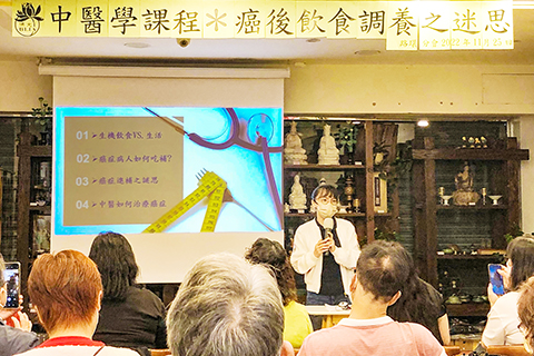 陳醫生當天以「癌後飲食調養之迷思」為題,向34位出席者講解癌症病人食補原則、生機飲食宜忌,同時為大眾解開了多個常見的調養迷思,包括:勿因擔心腫瘤長更快而減少吸收營養,反而患病期間更需要補充營養維持體重;患病期間患者需維持熱量、蛋白質尤其重要,如只進食全穀類或蔬果的「生機飲食」,有可能加重營養失衡,反不利治療;補充高劑量維生素未必能提升治癒率,甚至影響手術或化療的反效果,建議從適量的蔬菜和水果吸收天然抗氧化維生素會更為合適。