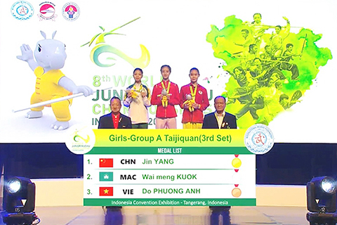 (澳門武總消息)澳門青少武術隊在印尼世賽來到賽事第四日,繼續取得亮麗成績,其中王泳欣在女子青年組槍術技壓群芳,先後擊敗東道主印尼、馬來西亞等強手,終站上最高頒獎台,為澳勇奪第二面金牌。個人完成所有賽事,共收獲一金兩銅。