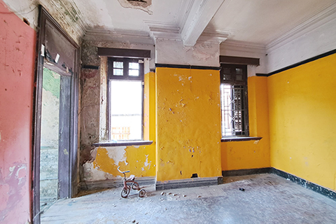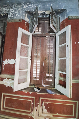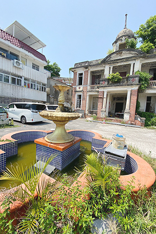 進入主樓地面的一層,內有不少廳房,但都給堆放了大量雜物、一綑綑的柴枝及垃圾,使人舉步維艱,幸好這古老大屋樓底高,而且門窗又已經殘破不全或沒有關上,所以室內光線充足,也十分通風,否則室內的霉味一定會讓人難以久留的。沿樓梯直上二樓,內進是一個偌大的廳堂,那裡又是另一番景象,廳堂以綠色為主色,不過由於年代久遠,又乏人修葺,所以油漆已有褪色和剥落的現象。廳中間放了一張圓桌,又鋪上了白枱布,上面有白色蠟燭的痕跡,可能曾經有探靈者在此進行招魂活動。主廳又相連多個房間,估算大概是有三個大廳及四個大房,還有廚房等空間。房間以大紅色或黃色為主色,看來這一層是主人居停的地方,這裡的窗戶皆採用歐洲式的兩層窗,就是玻璃窗加百葉窗,又因為樓底高,所以門戶都是分上下兩組的,下方為門,上方為通風的氣窗,但同樣是採用兩層式的窗戶設計。我們從走馬騎樓轉到大宅的後方,那裡可以俯瞰內院,但由於那裡已經為草叢所覆蓋,所以只能看到後院一片青翠,據說從前後院是有口井和池塘的。沿著樓梯上去,經過一個房間,便可到達天台,而那座半圓形屋頂的涼亭便出現在眼前。整個屋頂都雜草叢生,由於房屋已經是殘破不堪,而地上又滿佈雜物,多年來的荒廢,樹木已經蔓生到室內,所以我們走過的時候都要格外留神,步步為營的。◇(待續)