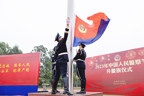 【記者陳藝珠海報道】昨天(一月十日)是中國人民警察節。珠海市公安局昨天上午在警官文化活動中心運動場隆重舉行慶祝二0二三年中國人民警察節升警旗儀式。珠海市副市長、市公安局黨委書記、局長謝仁思出席儀式並講話。珠海市公安局黨委班子成員,橫琴合作區公安局、各分局、市局直屬各部門主要領導,以及功模民警、基層民警輔警和志願員警代表二百六十多人參加活動。