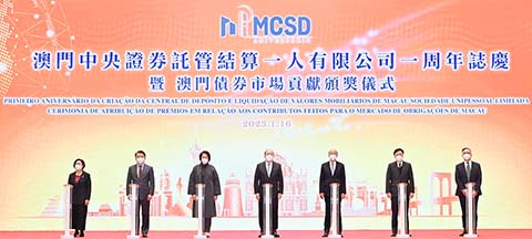 【專訪】澳門金融管理局與澳門中央證券託管結算一人有限公司(MCSD)合辦慶祝MCSD成立一周年誌慶暨澳門債券市場貢獻頒獎儀式,行政長官賀一誠等嘉賓主禮。