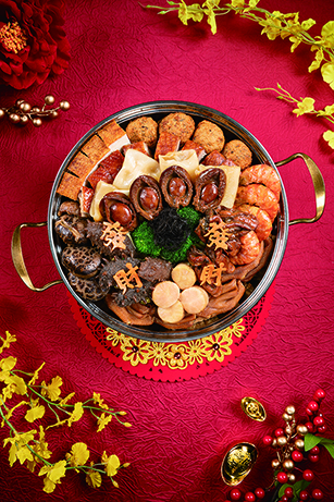 品粵軒:高端粵菜餐廳品粵軒供應外帶富貴盆菜,寓意新年團團圓圓、盆滿缽滿。各式矜貴食材包括蠔皇扣原隻鮑魚、雞汁燴花膠、蝦籽蔥燒刺參、紅燜獅頭鵝掌等,價格為澳門幣2,288元(供四位用),請在24小時前預訂。