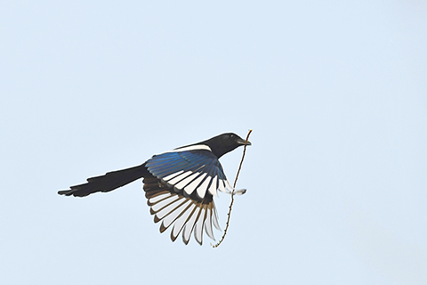 ◎ 一月一日,在山東省滕州市西崗鎮,喜鵲叼著樹枝準備築巢。新華社發(李志軍攝)