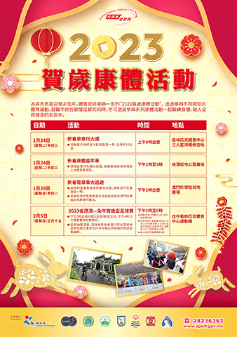更多新春賀歲康體活動詳情,可瀏覽體育局網頁 www.sport.gov.mo,關注「澳門大眾體育動向」Facebook 專頁、「澳門體育」微信公眾號及「澳門特區體育局」微信訂閱號,或致電2823 6363查詢。◇