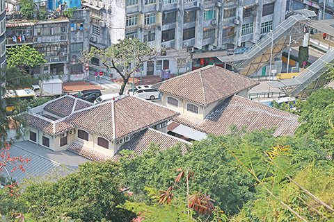 從望廈山往下看,紅褐色屋頂與土黃色牆身展現濃厚的葡式折衷主義建築風格特徵。此建築為大型桁架結構平房,四面坡的瓦片屋頂,其坡度低、跨度廣,飄簷外露出牆體,如今同類型建築僅存不多,這建築亦是望廈山腳自然與人文景觀結合的最佳例證,也是望廈區不可多得的特色建築。