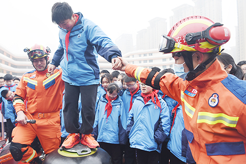 開學第一課 消防進校園 2023-02-07 03:30:00 ◎ 二月六日,消防救援人員讓學生體驗消防救援器材裝備。當日,安徽省合肥市消防救援支隊以開學季為契機,走進合肥五十中潛山路分校,開展消防安全「開學第一課」活動。(中新社發 朱小妹 攝)