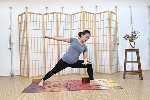 接著正式進入側角伸展式,先將髖關關節的曲度增加,這有助於脊柱維持中立和向上延展。從腹股溝朝下,屈膝九十度,臀部向下,大腿和地面平衡,小腿垂直於地面,以此來強化雙腿及胸肺。胸腔再向上提,雙臂有力的向橫伸展,脊柱保持充滿力量向上伸展。上臂從腋窩開始,延展兩條手臂伸展,目視屈膝一方的手掌及手指,此時手指應置放於地上的支撐物上。