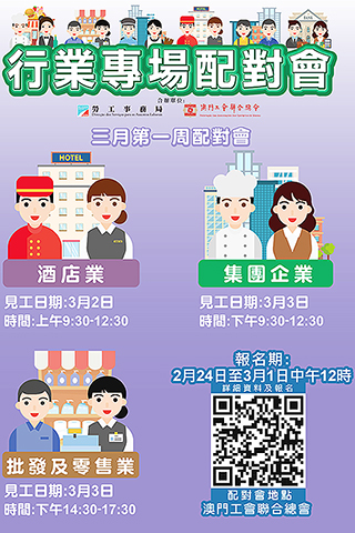 【特訊】為紓緩業界人資需求壓力,以及為協助有求職需求的澳門居民盡快就業,勞工事務局與澳門工會聯合總會合作,三月二日至三日舉辦三場行業專場配對會,合共提供二百三十個空缺,由二月二十四日起接受網上報名。