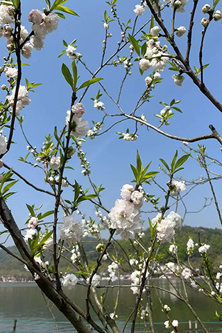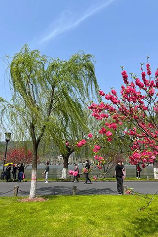而杭州最美賞花地是在西湖,三月必賞白堤看桃花。白堤最美時光在每年三月,間株桃花間株柳,湖水畔、草地上,紅桃綠柳如畫,我在堤上漫步,陽光照射青草散發味道——春的氣息。西湖桃花不只紅色,還有白色、粉色、淡紅淡白相間的胭脂色,色色皆美。花期也不長,一般三月到四月上旬,一期一會,錯過只有等來年。因此,要牢記古人的教誨:「有花堪折直須折,莫待無花空折枝。」全國各地的桃花,都在三月如期而至,「爭花不待葉,密綴欲無條。」這是蘇東坡寫早春桃花的句子。立春剛過,桃花著急地開了,也不等桃葉長出,生怕被其他花搶了先。密密的花朵,將樹條包裹住,看不到葉,也看不見枝,只見滿樹桃花,競相綻放,絢爛至極,如火把高擎空中點燃春日。