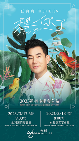 任賢齊「想你了」2023巡迴演唱會首站門票由即日起公開發售,票價為澳門幣380元起,可於永利官方售票網www.ticketing.wynnresortsmacau.com或親臨永利澳門永利大樓禮賓部及永利皇宮南接待處禮賓部售票處購買。