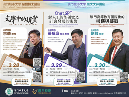 城大榮譽博士講座將於本月二十八日舉行,由著名作家余華教授以「文學中的現實」為題分享寶貴觀點;城大大師講座將於本月二十九日至三十日舉行,分別由國際人工智能領域專家張成奇傑出教授講述「ChatGPT對人工智能研究及社會發展的影響」,世界著名應用語言學和跨文化交際專家劉駿教授分析「澳門高等教育國際化的機遇與挑戰」。