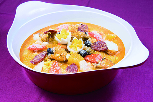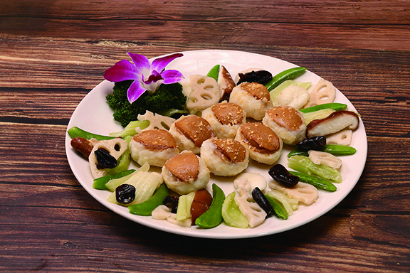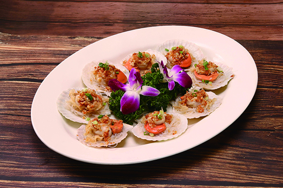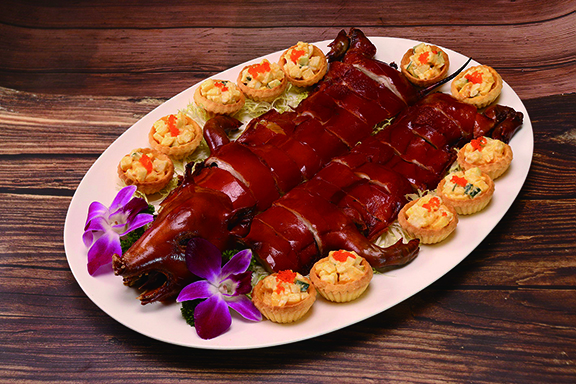 中菜食府凱旋軒帶來「凱旋春日運財宴」八人套餐。頭盤先來一道「香草沙律花燒奶豬」,運用醬燒方式令乳豬外皮酥脆,肉質軟嫩多汁,更以沙律撻圍繞整道菜式,展現春天百花齊放的美景,惹味豬肉配搭清新沙律,香脆可口而不膩。春天宜溫補,主廚採用「百草之王」人蔘、雞肉及花膠入饌,炮製出「滋潤鮮人蔘花膠燉雞」,味道順口甘醇,滋潤養生。還有「蒜蓉粉絲蒸扇貝」、「金沙泮水芹香炒釀鮑魚」、「芝士海蝦淮山麵」多道鮮甜美味的海鮮菜式,令人回味無窮。「凱旋春日運財宴」於晚市限量供應。