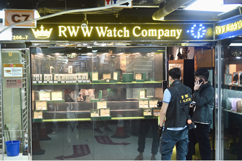 現場消息指,下午約三時,有四名建築工人打扮的南亞裔,其中兩人更頭戴安全帽走入店內,隨即用刀指嚇錶行職員。五分鐘內掠走半個飾櫃,奪走約五十隻名錶,包括四十九隻勞力士及一隻百達翡麗手錶,初步價值逾千萬港元;另外亦奪去職員的手機及約三萬港元現金後逃逸。